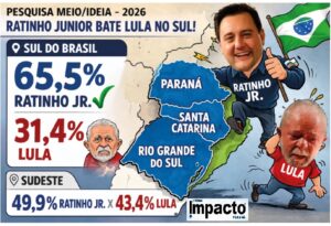O governador Ratinho Junior (PSD) tem uma vantagem cada vez mais consolidada contra Lula (PT) nas regiões Sul e Sudeste em um eventual segundo turno