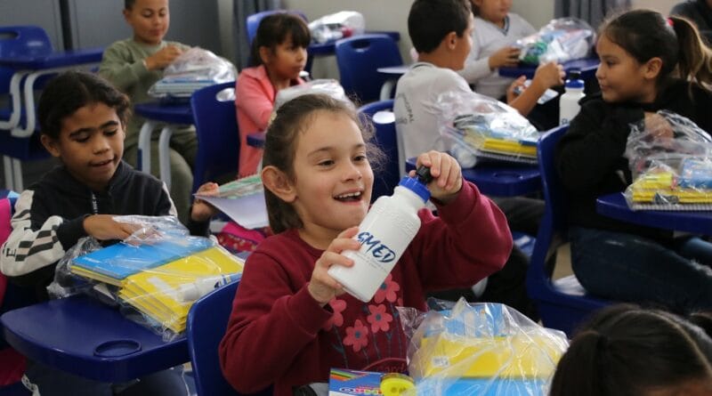 Read MoreAlunos são acolhidos em Cmeis e Escolas Municipais com kit de material escolar Sentada na carteira, dentro da sala de