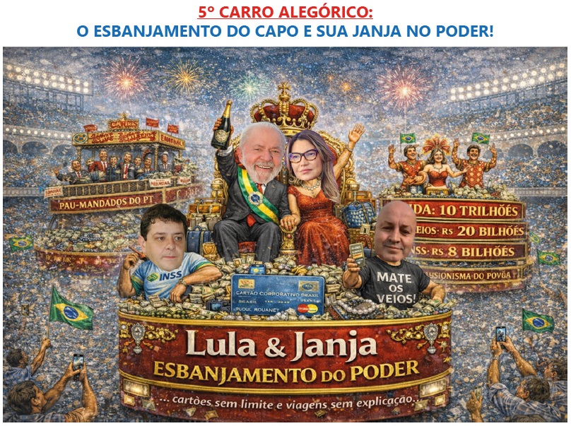 O último carro não poderia ser diferente é o CAPO, que comanda toda está tramoia, que colocou o Brasil em uma quebradeira das estatais, rombos do INSS, além das dívidas públicas que subiram absurdamente e pretende ficar mais quatro carnavais com sua caterva em Brasília. Lula tem ao lado um destaque negativo que é a esposa Janja, conhecida por gastos em viagens e gafes intermináveis em eventos internacionais sempre usando trajes exóticos e bolsas de marcas caríssimos e, ainda conta com o sigilo do cartão corporativo em viagens, para fazer o que bem quer. Outro destaque que não pode ser esquecido é o filho Lulinha, que recebeu mesada de R$ 300 mil do Careca do INSS, com valores repassados que chegam a R$ 25 milhões de reais. Um fato triste foi a escola não homenagear Marisa que aguentou este cidadão por tantos anos e morreu mais cedo que ele, depois de vender tantos produtos Avon….
