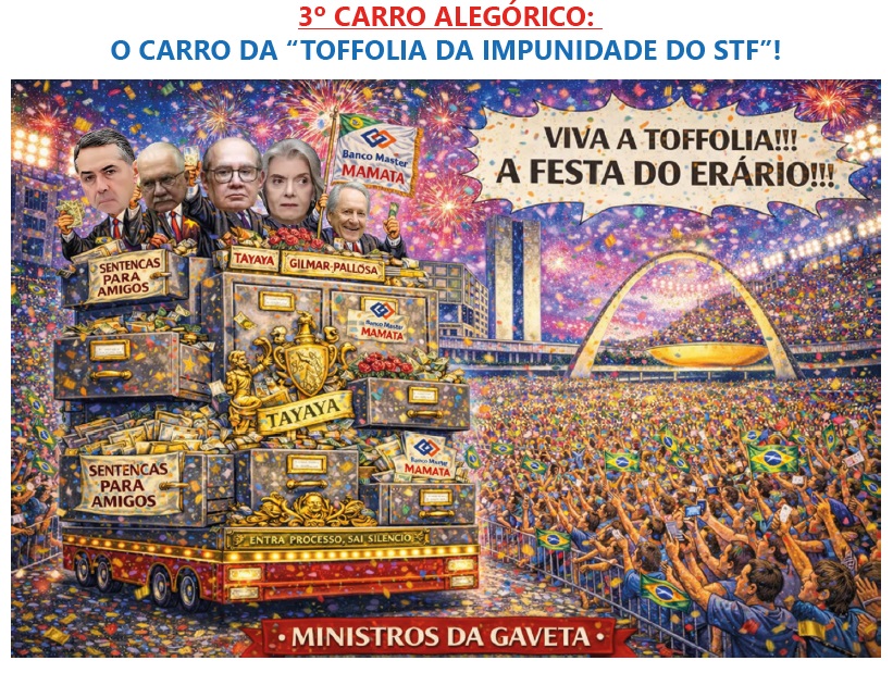 O Brasil da corrupção entra em cena nestes quatro dias de folia proporcionado pelo Carnaval Brasileiro. Na “PASSARELA DA CORRUPÇÃO ”, com o samba enredo nota 10, escolhido como “ ME DÁ UM DINHEIRO AÍ E MAMÃE QUERO ROUBAR”! A Sapucaí vai viver um verdadeiro espetáculo, aonde a realidade desfila fantasiada de normalidade enquanto o contribuinte tenta entender se está vendo carnaval ou miragem. Seguindo a sina de que “o ano só começa depois da folia” — mas, por aqui, parece que a folia é que nunca termina. A cada semana no governo do PT surge uma denúncia um conchavo ou uma negociata armada. Para iniciar o desfile nada melhor que a revelação do ano que foi Daniel Vorcaro!