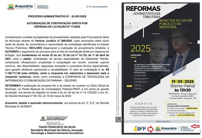 Ninguém está afirmando que o prefeito tenha ganho algo com esse processo, mas tudo levar crer que tem algo errado dentro da prefeitura de Araucária, pois no mês de abril já houve correria no sentido de contratar de forma emergencial um Datacenter hibrido do Celepar no valor de R$ 7,2 milhões para que não estagnasse todo sistema de dados da prefeitura. As coisas estão se tornando recorrentes dentro da prefeitura e isto deve abrir os olhos do Ministério Público para esse tipo de contratação.