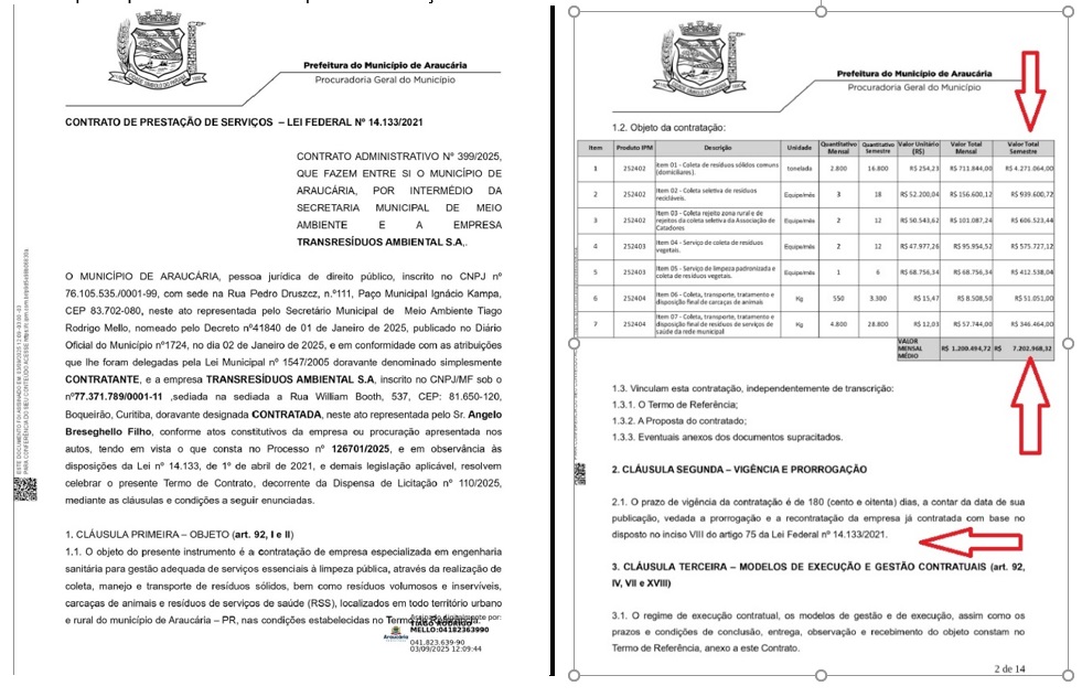 Neste mês de setembro, mais um contrato foi feito com dispensa de licitação no valor de R$ 7.202.968,00 com duração de seis meses para que a Transresíduos preste o serviço de coleta de lixo na cidade.