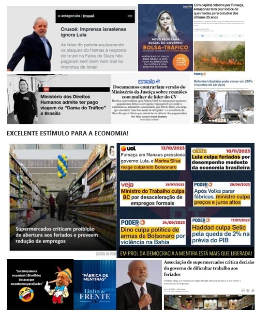 Já não se pode esperar de Lula apreço à verdade e raciocínio lógico de todas as situações em que o país está vivendo nestes últimos dias. Vejamos algumas manchetes que servem para nortear um governo da falsidade e mentiras. Depois de transformar a recepção dos brasileiros de Gaza em palanque político com um discurso absurdo contra Israel, adere a mais uma narrativa do grupo Hamas, dizendo que igualdade entre ambos, a visita da dama do tráfico demonstra a boa relação de Flávio Dino e companhia com as milícias.