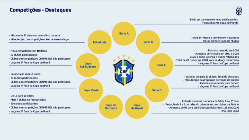 “Demos o primeiro passo na redução do excesso de jogos para clubes de Série A e ao mesmo tempo vamos promover mais oportunidades para federações e clubes em competições nacionais, democratizando o futebol brasileiro. Times que passavam meses inativos, após seus Estaduais, agora terão competições nacionais para jogar”, afirmou o diretor de competições da CBF, Julio Avellar.