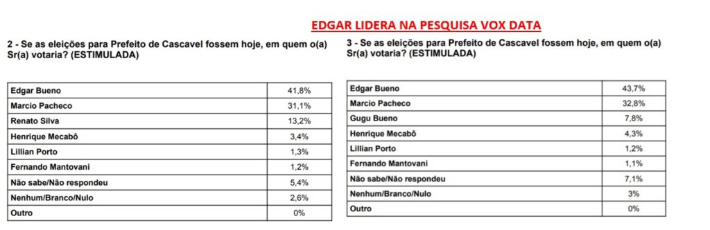 EDGAR LIDERA NA PESQUISA VOX DATA