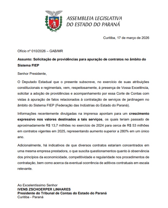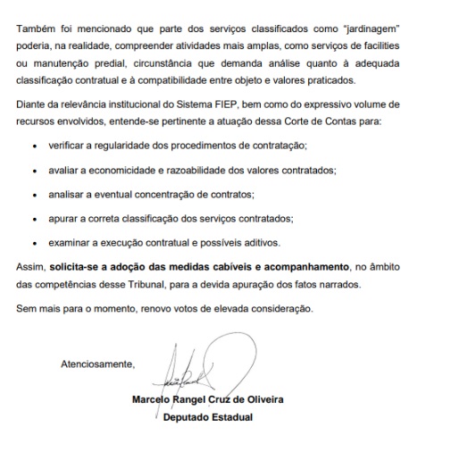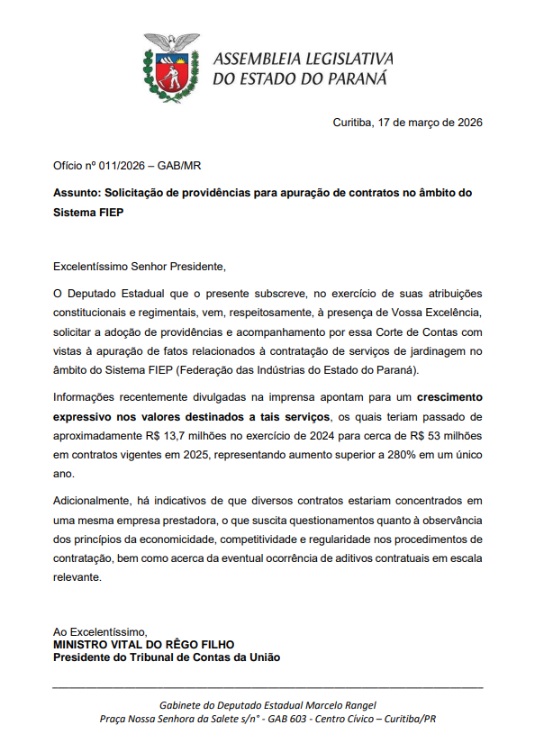 O deputado estadual Marcelo Rangel mandou dois ofícios nessa semana ao Tribunal de Contas da União (TCU) e Tribunal de Contas Estado (TCE) pedindo providências e acompanhamento da Corte sobre contratação de serviços de jardinagem no âmbito do Sistema FIEP (Federação das Indústrias do Estado do Paraná), principalmente durante a gestão de Edson Vasconcelos.
