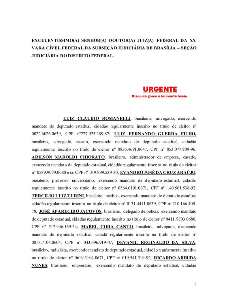 Esta nova ação na Justiça Federal foi apresentada pelas deputadas Cristina Silvestri (PP), Luciana Rafagnin (PT), Mabel Canto (PP), Márcia Huçulak (PSD) e Maria Victória (PP) e pelos deputados Luiz Cláudio Romanelli (PSD), Evandro Araújo (PSD), Tercílio Turini (MDB), Delegado Jacovós (PL), Cobra Repórter (PSD), Ricardo Arruda (PL), Paulo Gomes Júnior (PP), Do Carmo (UB), Luiz Fernando Guerra (UB), Hussein Bakri (PSD), Luís Corti (PSB), Adão Litro (PSD), Nelson Justus (UB), Anibelli Netto (MDB), Fábio Oliveira (Podemos),