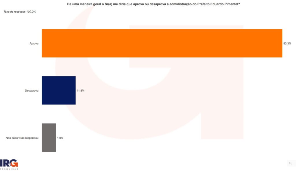 Segundo os dados apurados, 83,3% dos entrevistados afirmaram aprovar o atual governo. A taxa de desaprovação ficou em 11,8%, enquanto 4,9% disseram não saber ou preferiram não opinar. A pesquisa registrou 100% de taxa de resposta, o que reforça a confiabilidade dos resultados.