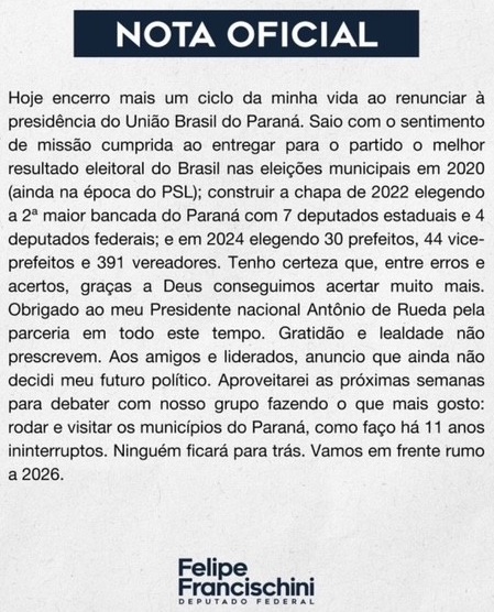 Na manhã dessa quinta-feira (04), o deputado federal Felipe Francischini, divulgou uma nota oficial em suas redes sociais, informando a renúncia da presidência do União Brasil no Paraná , em função do anúncio feito na quarta-feira (03) do senador Sergio Moro que iria assumir o diretório estadual.