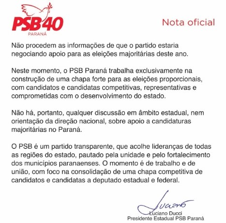 O jantar na última sexta-feira(30), entre os membros do diretório estadual do PSB/PR (Manassés Oliveira, Paulo Rossi e Messias da Silva), reunindo a ministra e pré-candidata ao Senado, Gleisi Hoffmann(PT); o deputado estadual e pré-candidato ao governo, Maurício Requião(PDT); o ex-ministro da Saúde, Alceni Guerra e o ex-deputado federal, Pedro Guerra, desagradou o ainda presidente do Partido Socialista Brasileiro no Paraná, Luciano Ducci, que emitiu uma nota do PSB/PR negando qualquer acordo na composição da majoritária ao governo do Paraná, criando uma disputa interna entre membros da legenda. De um lado os que defendem a indicação de Alceni Guerra para compor a vice na chapa de Maurício Requião ao governo do Paraná, e de outro o deputado federal Luciano Ducci que diz estar preocupado com a chapa proporcional de deputados, acabou passando “recibo” ao negar o direito do PSB/PR apoiar a reeleição do Lula à presidência. Segundo um dos integrantes que já estão sendo chamados dos “Três Mosqueteiros”, Luciano peca ao não dialogar com as bases e querer impor uma coligação com a direita no Paraná. Vamos aguardar os próximos capítulos que virão de Brasília pra saber quem vence a disputa pelo comando dos socialistas no Paraná.