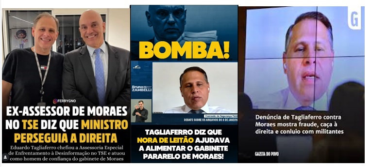 Quem assistiu a entrevista no programa DIRETO AO PONTO do jornalista Ogier Buchi, realizada em agosto, não teve mais dúvidas que as denúncias feitas por Eduardo Tagliaferro de que ele e mais nove assessores fiscalizavam as redes sociais realmente faziam parte do Gabinete do Ódio, mas de dentro do Supremo Tribunal Federal. Tagliaferro denunciou que eles eram obrigados a perseguir perfis e redes sociais somente de pessoas que eram da linha de direita. Com dados detalhados de como funcionava as ordens de Alexandre de Moraes ficou explícito que todo o Supremo trabalhou para vitória de Lula do PT. Todos os meios usados pelo STF modificaram claramente os resultados das eleições com as atitudes de censura e perseguição a simpatizantes de Jair Bolsonaro.Tagliaferro está na Itália nesse momento com medo das ações que deverão cair sobre sua cabeça a mando de Xandão.