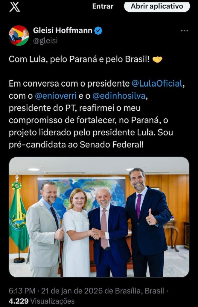 A ministra das Relações Institucionais, Gleisi Hoffmann (PT), confirmou que irá disputar uma vaga ao Senado pelo Paraná. O anúncio foi feito nesta quarta-feira (21), em Brasília, consolidando o nome da ministra como a principal aposta do Partido dos Trabalhadores na corrida eleitoral no estado.