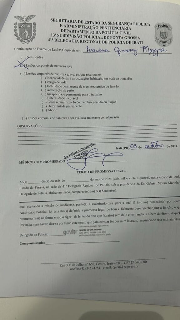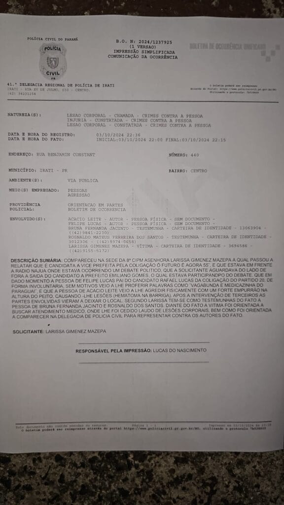De acordo com divulgações da imprensa iratiense, o debate ainda estava sendo levado ao ar, na noite dessa quinta (3), quando o pai de Felipe chegou com Acácio Leite. Ele estava alterado e proferindo ‘palavrões’. Houve tumulto e agressão contra a candidata que, conforme exame de corpo delito, sofreu lesões que resultaram em hematomas na região abdominal. Na delegacia de polícia ela estava acompanhada pelo advogado Arthuro Antoniassi. Duas das 15 testemunhas deram depoimentos.