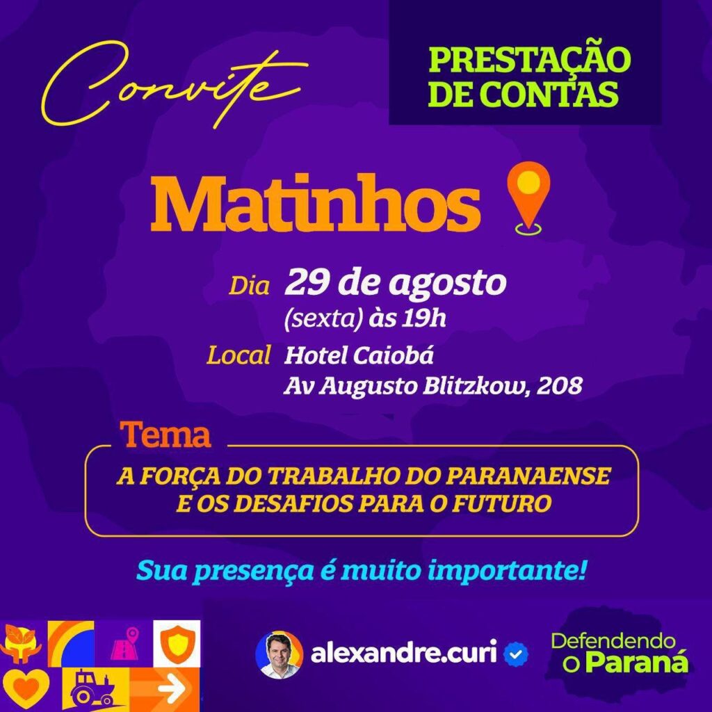 O deputado Alexandre Curi (PSD) promove na noite desta sexta-feira (29), um encontro de prestação de contas na cidade de Matinhos que reunirá entre prefeitos da região litorânea, vários deputados, vice-prefeitos, vereadores, além de lideranças políticas, empresariais e sociais da região estarão presentes. O encontro será no Hotel Caiobá as 19 horas e o anfitrião será o Prefeito Eduardo Dalmora que acompanha Alexandre há vários anos e fui dos apoiadores da campanha do atual prefeito.
