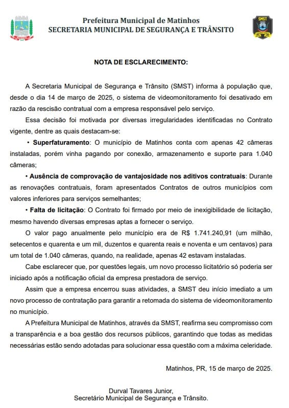 Veja a nota completa emitida pelo secretário de segurança e trânsito do município,