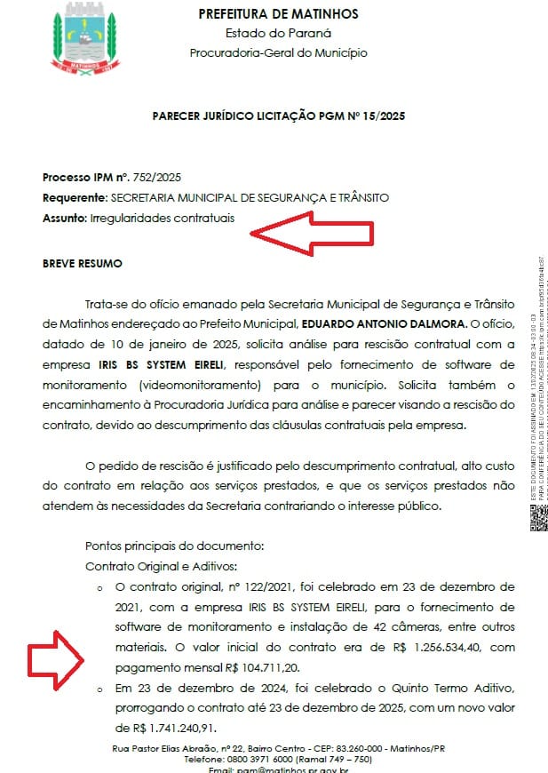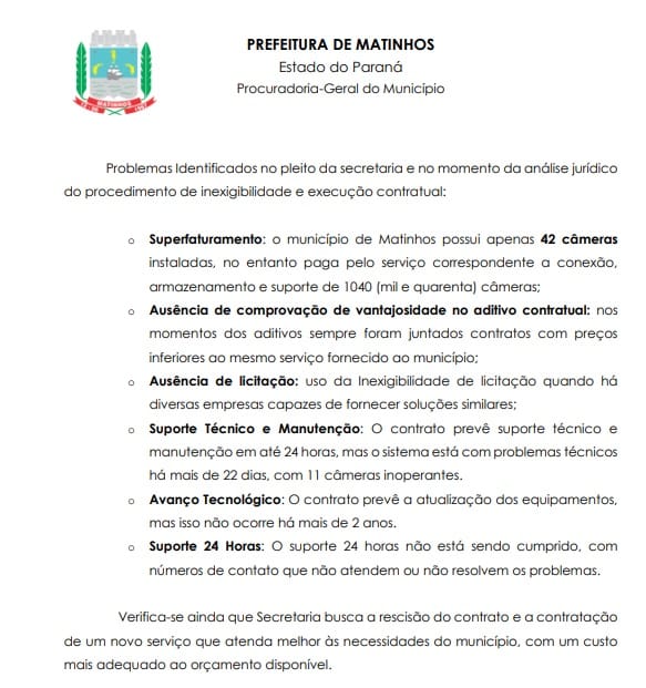 O município vinha pagando por 1.040 câmeras, mas apenas 42 estavam instaladas. Além do superfaturamento, foram constatadas ausência de licitação e falta de comprovação de vantajosidade nos aditivos contratuais.