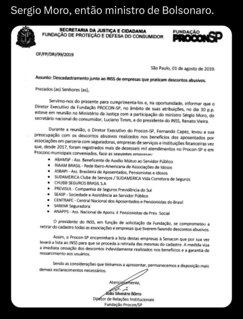 “Eu publiquei os documentos (sobre as fraudes no INSS) que não são meus, são do Procon de São Paulo. As iniciativas do Ministério Público de São Paulo”, completou Zeca Dirceu sobre “as inúmeras denúncias que chegaram à época ao ministro Sérgio Moro”.