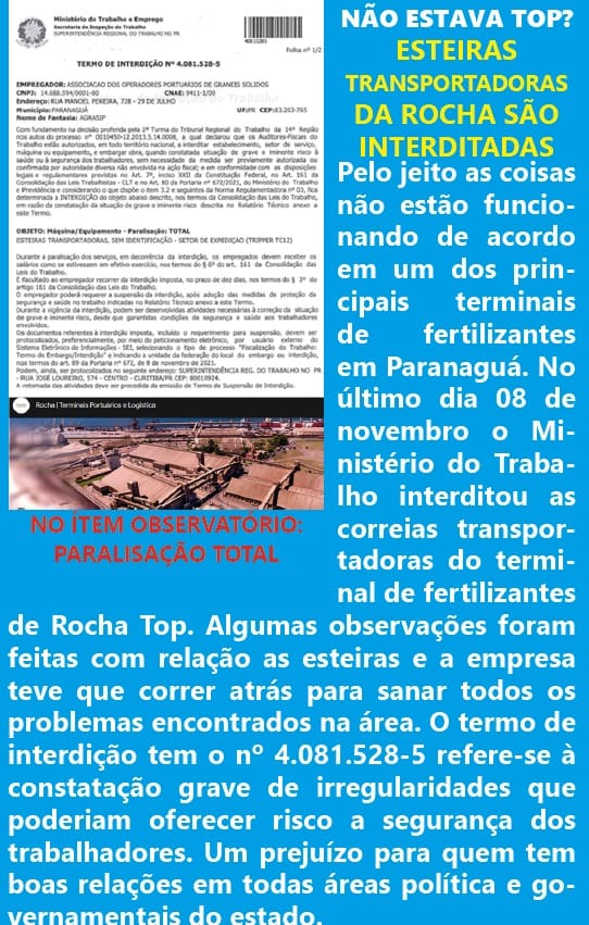 Pelo jeito as coisas não estão funcionando de acordo em um dos principais terminais de fertilizantes em Paranaguá. No último dia 08 de novembro o Ministério do Trabalho interditou as correias transportadoras do terminal de fertilizantes de Rocha Top. Algumas observações foram feitas com relação as esteiras e a empresa teve que correr atrás para sanar todos os problemas encontrados na área. O termo de interdição tem o nº 4.081.528-5 refere-se à constatação grave de irregularidades que poderiam oferecer risco a segurança dos trabalhadores. Um prejuízo para quem tem boas relações em todas áreas política e governamentais do estado.