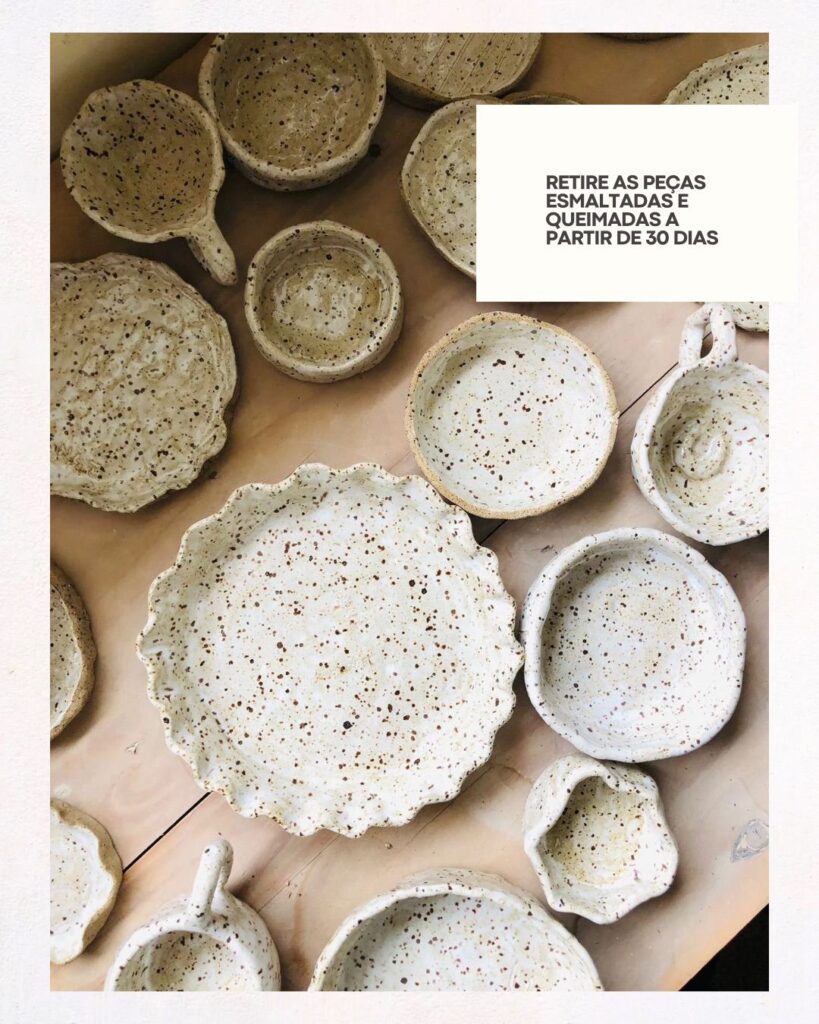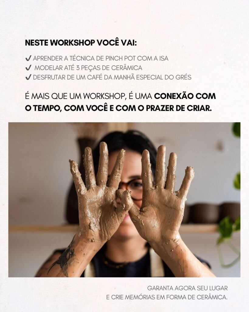Das 9h30 às 12h, os participantes vivenciam o universo da cerâmica por meio da técnica de pinch pot, com condução de Isa, da Zoca Cerâmica. Durante a atividade, cada pessoa pode modelar até três peças, que posteriormente passam por processos de esmaltação e queima, com retirada prevista em cerca de 30 dias.