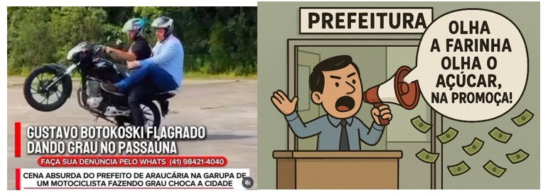 Para quem deveria estar atendendo as necessidades básicas da saúde no município, o tal prefeito Gustavo Botogoski, que se vislumbrou com o poder e atende pessoas reservadas em sua sala nas tardes para carimbar o carnê. Ele agora foi praticar o motociclismo radical na garupa no Parque do Passaúna para a prática esportiva do grau. Enquanto isso o tal de Laércio, que gritava nos supermercados vendendo farinha, grita com seu megafone dentro da prefeitura para abafar as cágadas do marinheiro alcaide de primeira viagem.