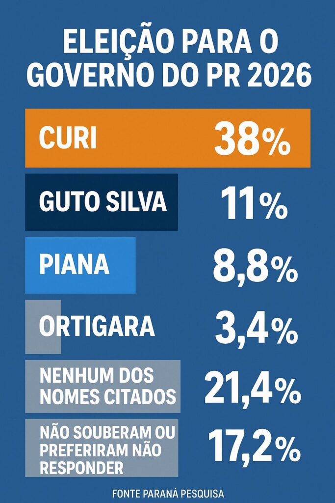 A PARANÁ PESQUISA divulgou nesta terça-feira (02) um levantamento que indica o maior beneficiário de um possível apoio de Ratinho Junior para o Governo do Paraná em 2026. Com esse apoio a liderança da lista de transferência de votos do governador está o presidente da Assembleia Legislativa, o deputado Alexandre Curi, que conquista 38,2% do eleitorado de Ratinho e tem três vezes mais indicações que o segundo nome que é Guto Silva, secretário das Cidades do Paraná, com 11%.