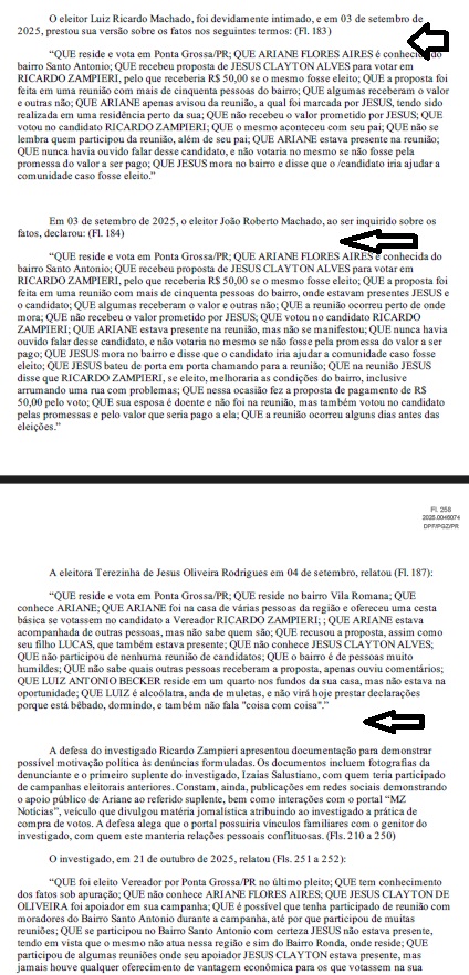 De acordo com os autos, a denúncia foi apresentada por Ariane Flores Aires, que se identifica como líder comunitária no bairro Jardim Maracanã. Ela diz ter sido procurada por Jesus Clayton de Oliveira, apontado como assessor da campanha de Zampieri, que teria oferecido R$1 mil em espécie para captar votos entre os moradores.