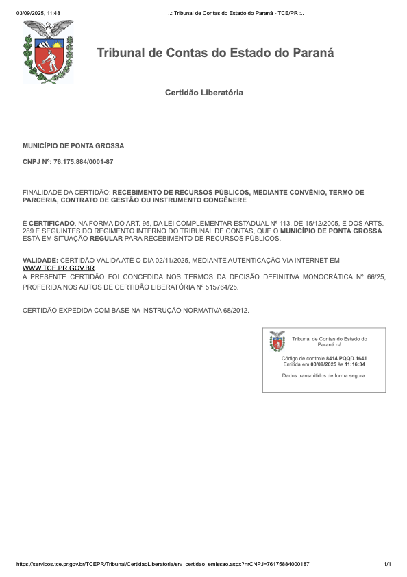 Para surpresa geral, a cidade de Ponta Grossa quase foi penalizada com a falta de certidão liberatória do Tribunal de Contas. Na última semana o Município chegou a ficar alguns dias no vermelho.