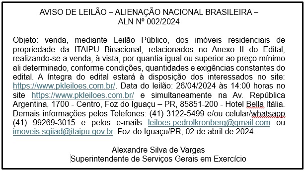 Objeto: venda, mediante Leilão Público, dos imóveis residenciais de propriedade da ITAIPU Binacional, relacionados no Anexo II do Edital, realizando-se a venda, à vista, por quantia igual ou superior ao preço mínimo ali determinado, conforme condições, quantidades e exigências constantes do edital. A íntegra do edital estará à disposição dos interessados no site: https://www.pkleiloes.com.br/. Data do leilão: 26/04/2024 às 14:00 horas no site https://www.pkleiloes.com.br/ e simultaneamente na Av. República Argentina, 1700 – Centro, Foz do Iguaçu – PR, 85851-200 – Hotel Bella Itália. Demais informações pelos Telefones: (41) 3122-5499 e/ou celular/whatsapp (41) 99269-3015 e pelos e-mails leiloes.pedrolkronberg@gmail.com ou imoveis.sgiiad@itaipu.gov.br. Foz do Iguaçu/PR, 02 de abril de 2024.