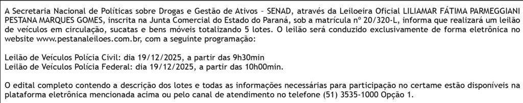 PUBLICAÇÃO LEGAL: LEILÃO DA Secretaria Nacional de Políticas sobre Drogas e Gestão de Ativos – SENAD PR – 19/12/25 Polícia Civil às 9h30 e Policia Federal ás 10h00min