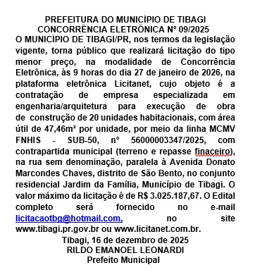 PUBLICAÇÃO LEGAL : PREFEITURA DO MUNICÍPIO DE TIBAGI – CONCORRÊNCIA ELETRÔNICA 09/2025