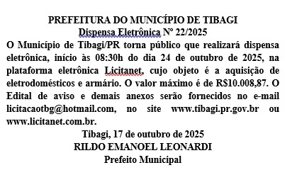 PUBLICAÇÃO LEGAL : PREFEITURA DO MUNICÍPIO DE TIBAGI – DISPENSA ELETRÔNICA Nº 22/2025