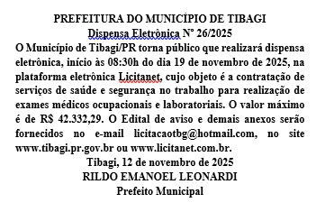 PUBLICAÇÃO LEGAL : PREFEITURA DO MUNICÍPIO DE TIBAGI – DISPENSA ELETRÔNICA nº 26/2025