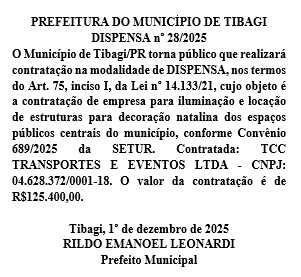 PUBLICAÇÃO LEGAL : PREFEITURA DO MUNICÍPIO DE TIBAGI –DISPENSA Nº 28/2025