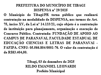 PUBLICAÇÃO LEGAL : PREFEITURA DO MUNICÍPIO DE TIBAGI –DISPENSA Nº 29/2025