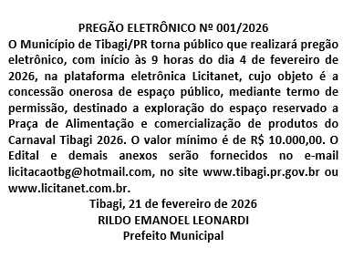 PUBLICAÇÃO LEGAL : PREFEITURA DO MUNICÍPIO DE TIBAGI – PREGÃO ELETRÔNICO nº 001/2026