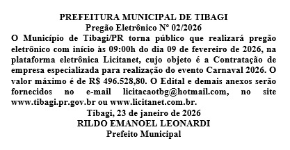 PUBLICAÇÃO LEGAL : PREFEITURA DO MUNICÍPIO DE TIBAGI – PREGÃO ELETRÔNICO nº 02/2026