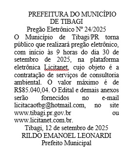 PUBLICAÇÃO LEGAL : :PREFEITURA DO MUNICÍPIO DE TIBAGI-Pregão Eletrônico Nº 24/2025