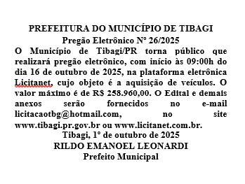 PUBLICAÇÃO LEGAL : PREFEITURA DO MUNICÍPIO DE TIBAGI – PREGÃO ELETRÔNICO Nº 26/2025