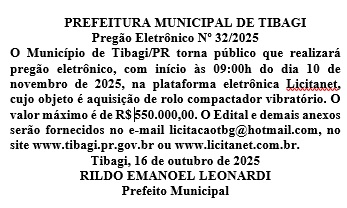 PUBLICAÇÃO LEGAL : PREFEITURA DO MUNICÍPIO DE TIBAGI – PREGÃO ELETRÔNICO nº 32/2025