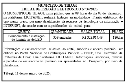 PUBLICAÇÃO LEGAL : PREFEITURA DO MUNICÍPIO DE TIBAGI – PREGÃO ELETRÔNICO nº 34/2025