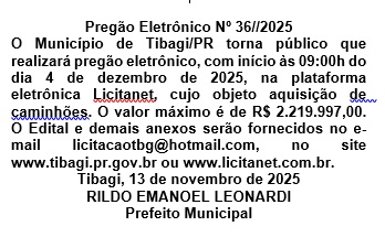 PUBLICAÇÃO LEGAL : PREFEITURA DO MUNICÍPIO DE TIBAGI – PREGÃO ELETRÔNICO nº 36/2025