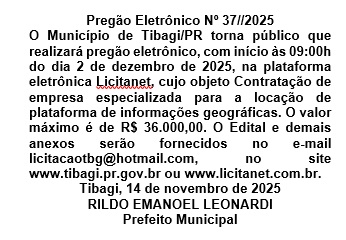 PUBLICAÇÃO LEGAL : PREFEITURA DO MUNICÍPIO DE TIBAGI – PREGÃO ELETRÔNICO nº 37/2025
