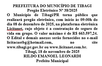 PUBLICAÇÃO LEGAL : PREFEITURA DO MUNICÍPIO DE TIBAGI – PREGÃO ELETRÔNICO nº 38/2025