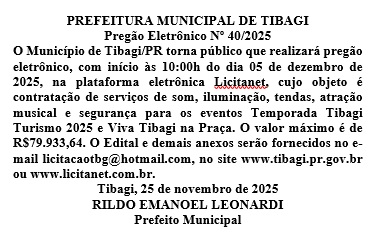 PUBLICAÇÃO LEGAL : PREFEITURA DO MUNICÍPIO DE TIBAGI – PREGÃO ELETRÔNICO nº 40/2025