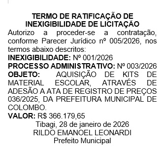 PUBLICAÇÃO LEGAL : PREFEITURA DO MUNICÍPIO DE TIBAGI – RATIFICAÇÃO DE INEXIGIBILIDADE DE LICITAÇÃO 001/2026
