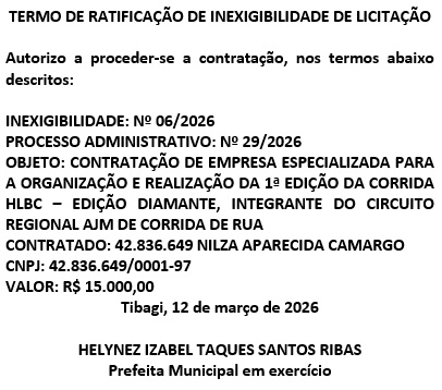 PUBLICAÇÃO LEGAL : PREFEITURA DO MUNICÍPIO DE TIBAGI –TERMO DE RATIFICAÇÃO DE INEXIGIBILIDADE DE LICITAÇÃO nº 006/2026