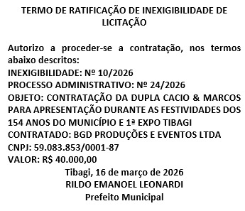 PUBLICAÇÃO LEGAL : PREFEITURA DO MUNICÍPIO DE TIBAGI –TERMO DE RATIFICAÇÃO DE INEXIGIBILIDADE DE LICITAÇÃO nº 10/2026