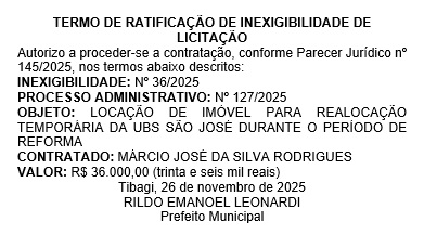 PUBLICAÇÃO LEGAL : PREFEITURA DO MUNICÍPIO DE TIBAGI – TERMO DE RATIFICAÇÃO DE INEXIGIBILIDADE DE LICITAÇÃO Nº 36/2025
