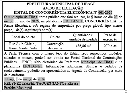 PUBLICAÇÃO LEGAL: PREFEITURA MUNICIPAL DE TIBAGI- AVISO DE LICITAÇÃO: EDITAL DE CONCORRÊNCIA ELETRÔNCIA Nº 001/2026