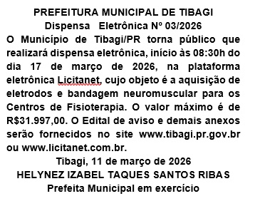 PUBLICAÇÃO LEGAL :PREFEITURA MUNICIPAL DE TIBAGI- DISPENSA ELETRÔNICA Nº 03/2026